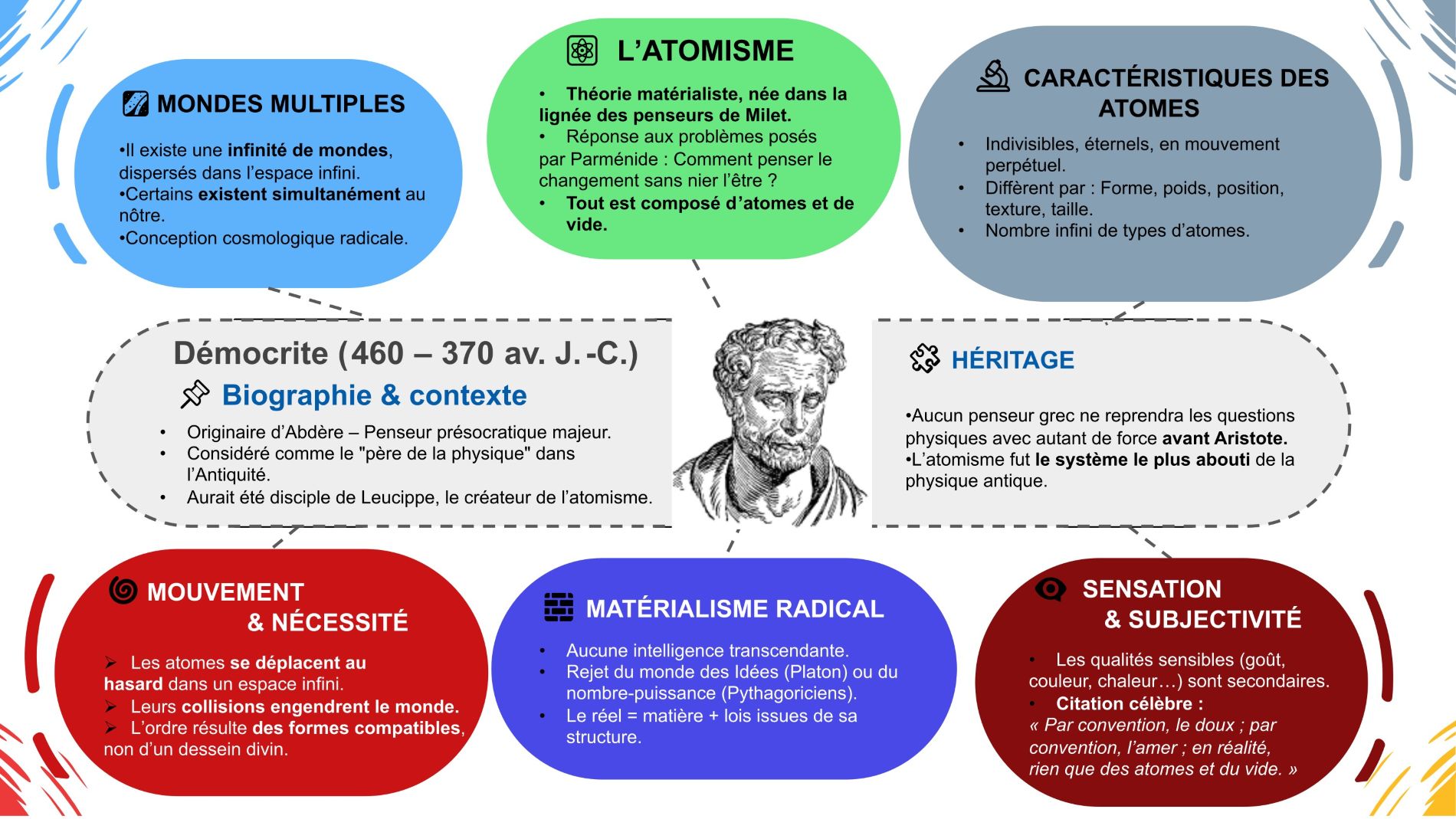 - L’Amour et la Haine Empédocles postule que l’univers alterne entre deux forces cosmiques : l’Amour, qui unit, et la Haine, qui sépare. Tout suit un cycle dominé par la nécessité, où le mélange et la séparation des éléments sont constants.≪ Serment vaste et ancien de la nécessité intolérable ≫ (ανάγκη δύστλητος),