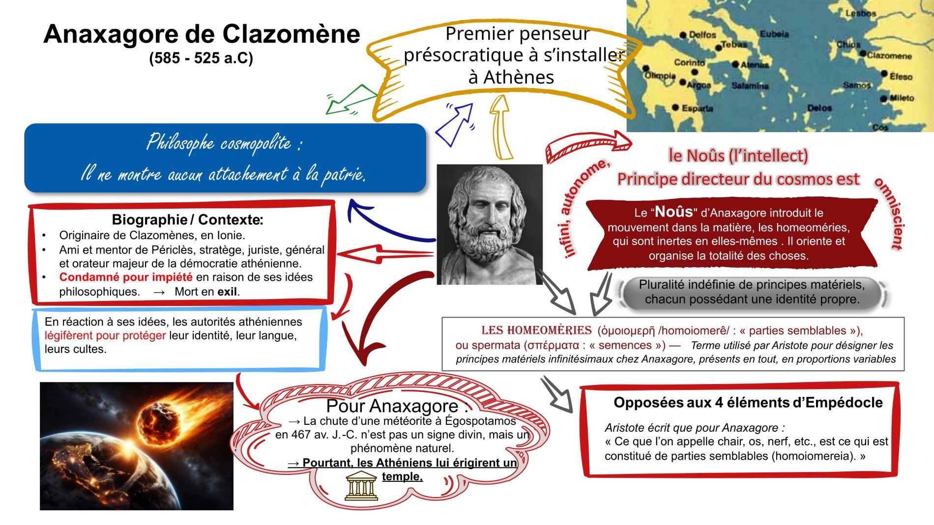 Naturel d’Akragas (Agrigente), une colonie dorienne de Sicile, Empédocles provenait d’une famille noble et s’impliqua dans la politique, s’opposant à l’oligarchie et rétablissant la démocratie en 472 av. J.-C. Après une réaction politique, il fut exilé et mourut probablement dans le Péloponnèse. Sa figure fut entourée de légendes, et sa mort donna lieu à plusieurs versions. La plus connue, bien que probablement fausse, raconte qu’il se jeta dans l’Etna pour être considéré comme immortel, mais le volcan rejeta l’une de ses sandales, ce qui révéla la supercherie. Empédocles écrivit deux poèmes en dialecte ionien : Sur la Nature et Purifications. Dans le premier, il aborde des problèmes cosmologiques similaires à ceux d’autres présocratiques. Dans le second, il adopte un style plus fleuri et mystique, se présentant comme thaumaturge ou dieu. Les différences entre les deux ne sont pas suffisantes pour supposer l’existence de deux auteurs distincts.
