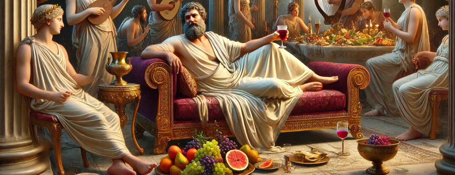 Aristippe de Cyrène, élégamment vêtu, allongé sur un divan lors d’un banquet grec (symposion).