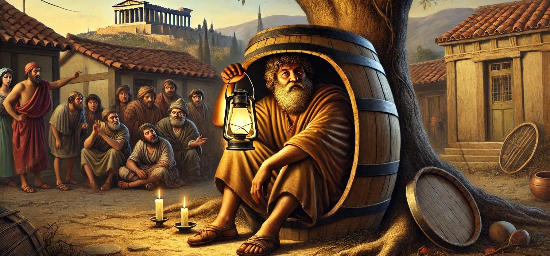 Diogène dans son tonneau, tenant une lanterne à la recherche d’un « homme honnête »